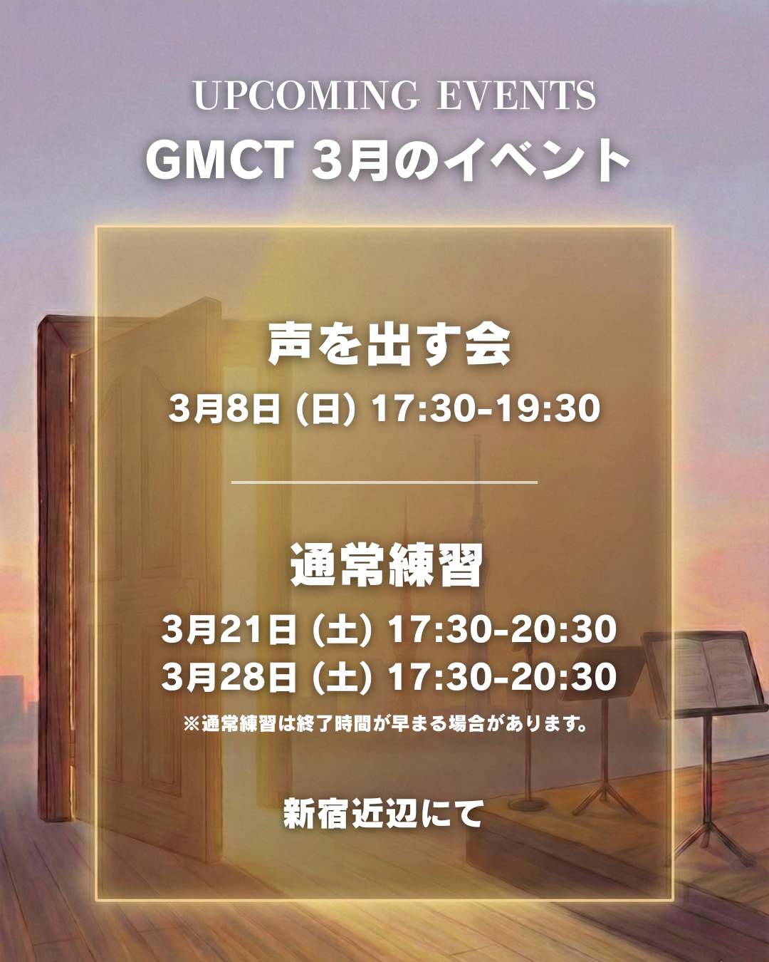 そろそろ年度末ですね。何かと忙しい時期ですが、GMCTの3月の練習日程が決まりました!日程の詳細は、下記の画像をご確認ください。3月も参加費はかかりませんので、ぜひお気軽に見学・体験にいらしてください。春から新しいことを始めたい方も大歓迎です🌸・3/8(日)17:30–19:30 ・3/21(土)17:30–20:30 (終了時間が早くなる可能性もあります) ・3/28(土)17:30–20:30 (終了時間が早くなる可能性もあります)🔗見学ページリンクニュース一覧へShare